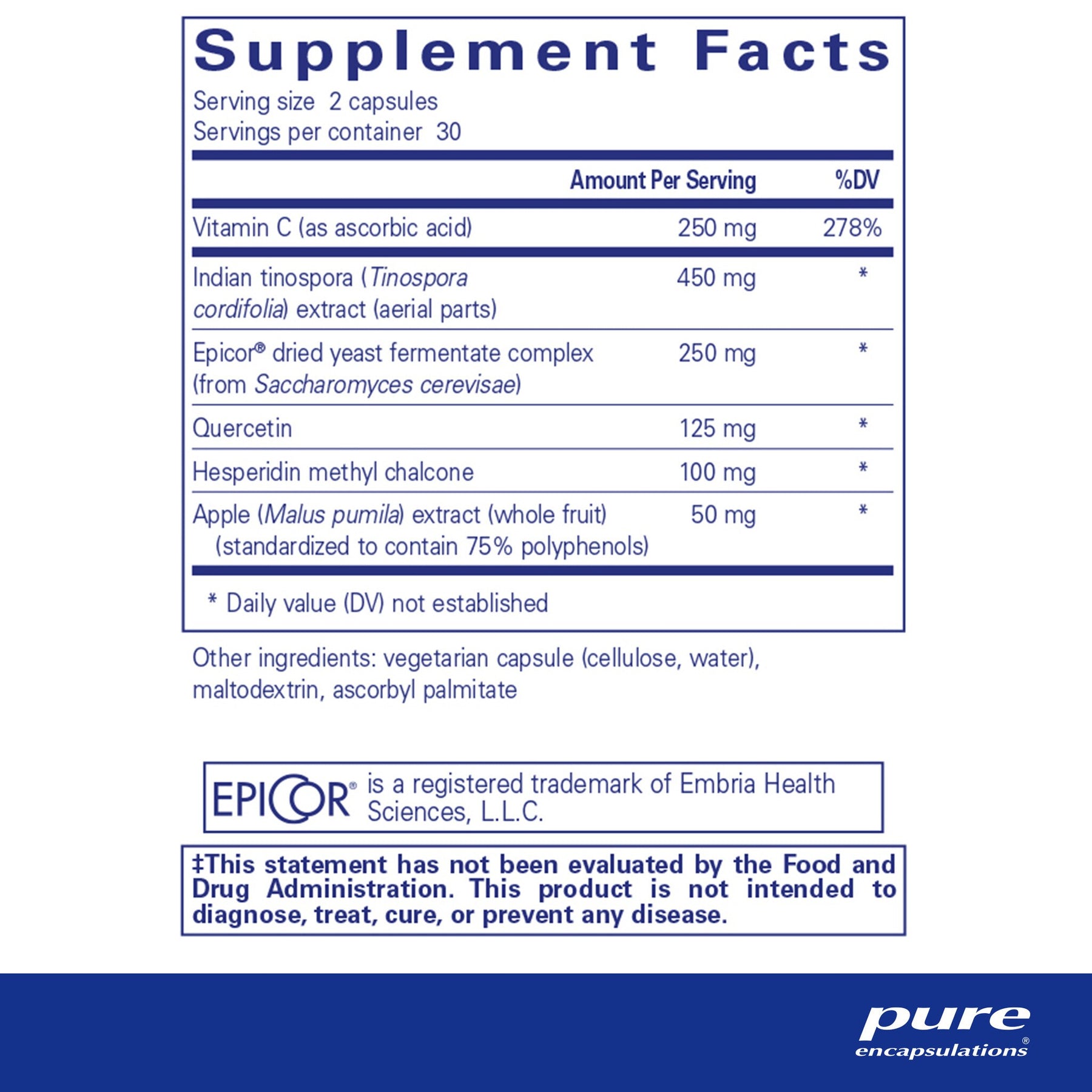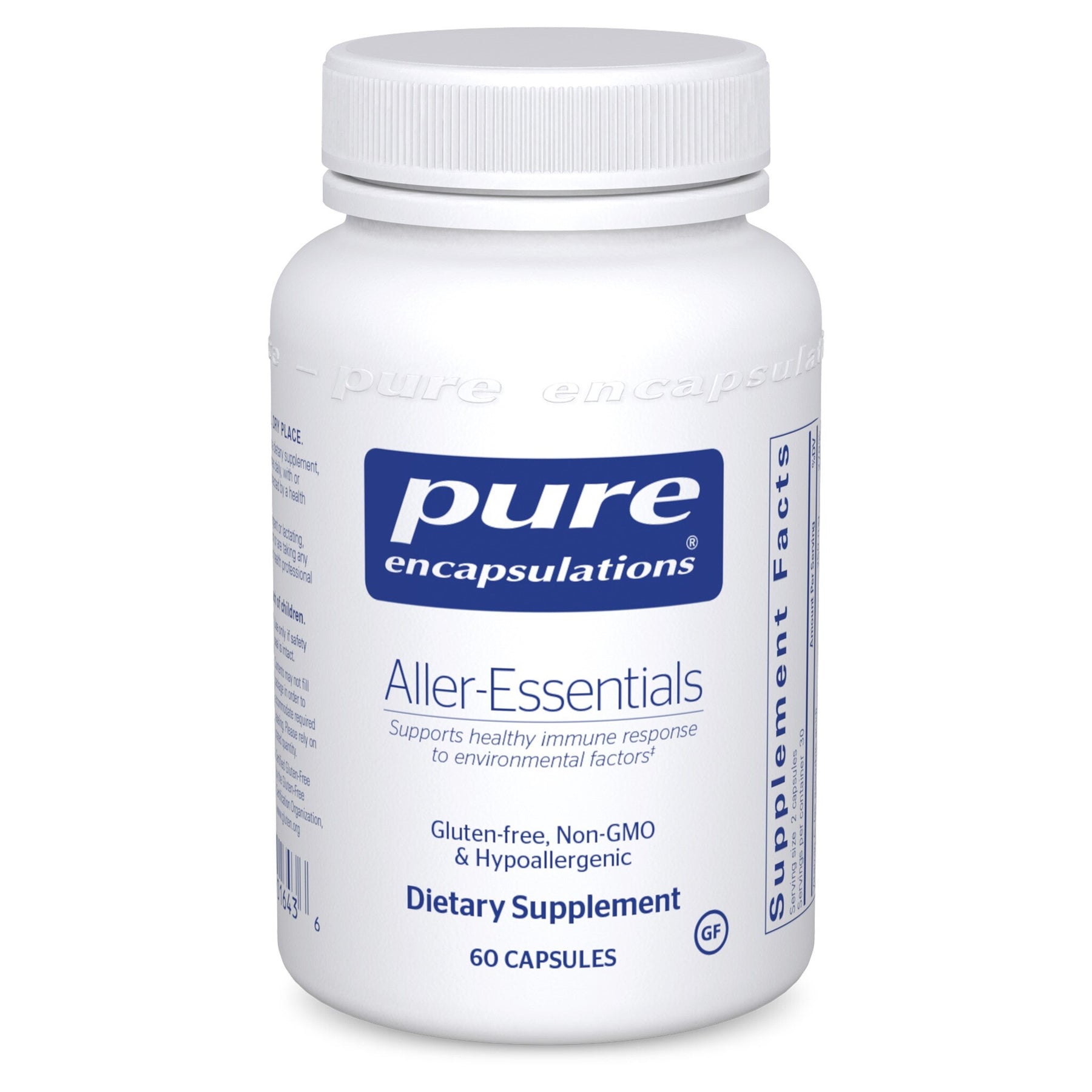 Aller-Essentials contains a blend of nutrients and herbal extracts designed to maintain healthy seasonal immune function. EpiCor Saccharomyces cerevisiae fermentate contains numerous immune enhancing bioactive metabolites designed to support both innate and adaptive immune response. Research suggests that it enhances natural killer cell activation, B cell and T cell function, and salivary IgA levels. In a double-blind, placebo-controlled trial involving 96 subjects, EpiCor supported nasal comfort during a 12-week period in the spring. Additionally, it supported salivary IgA levels, an important first-line defense produced by the mucosal tissue. In a randomized double-blind trial involving 75 individuals, Tinospora cordifolia provided significant support for a healthy immune response by maintaining normal nasal function as well as healthy neutrophil and eiosinophil activity. A randomized double-blind, placebo-controlled trial involving apple polyphenols reveals support for maintaining a healthy nasal lining and nasal function. Quercetin, hesperidin and vitamin C provide additional support for stabilizing mast cells.