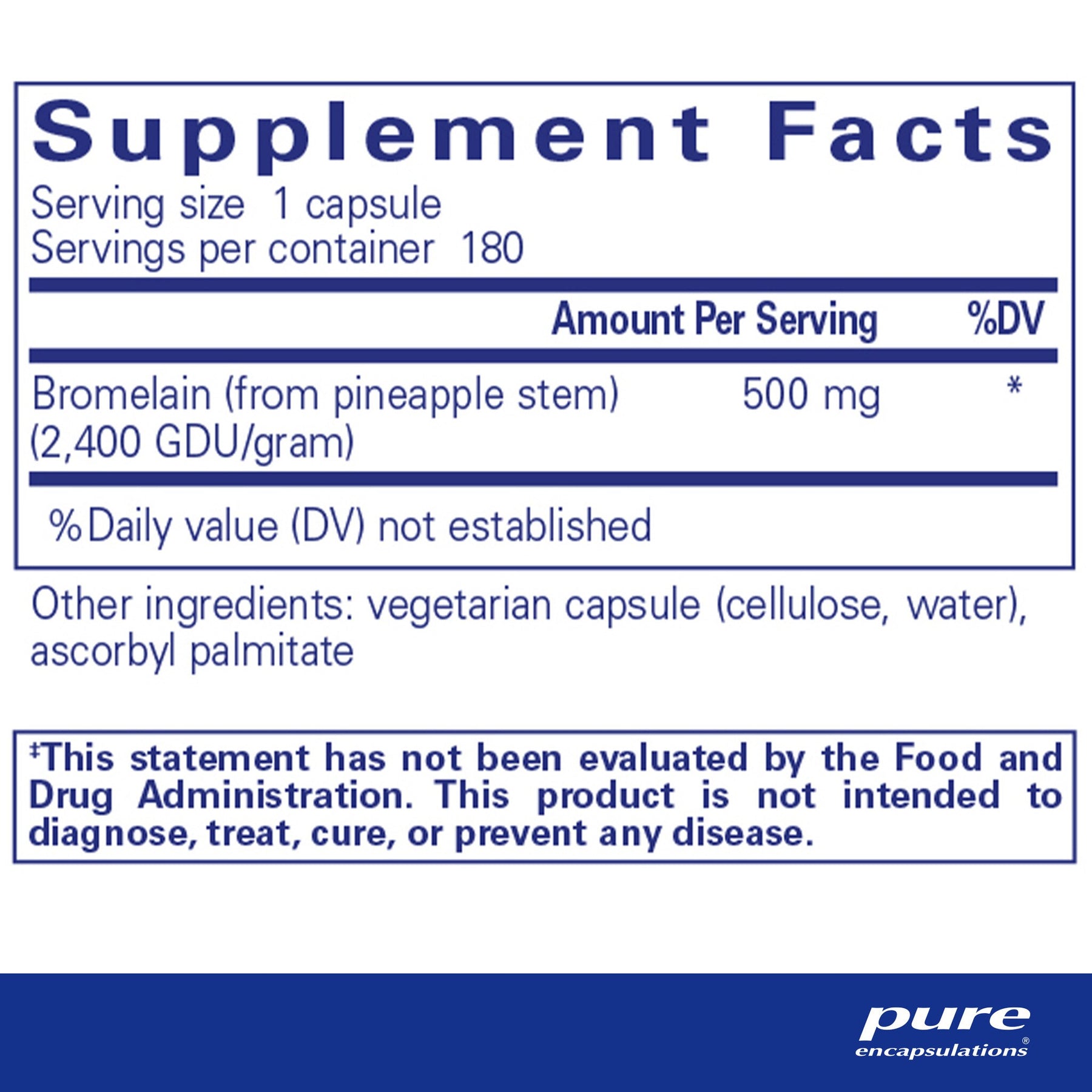 Bromelain is a proteolytic enzyme from the stem of the pineapple plant. Taken with food, bromelain aids in the healthy functioning of the digestive system. Taken between meals, bromelain maintains healthy kinin and fibrin production, supporting healthy musculoskeletal function.