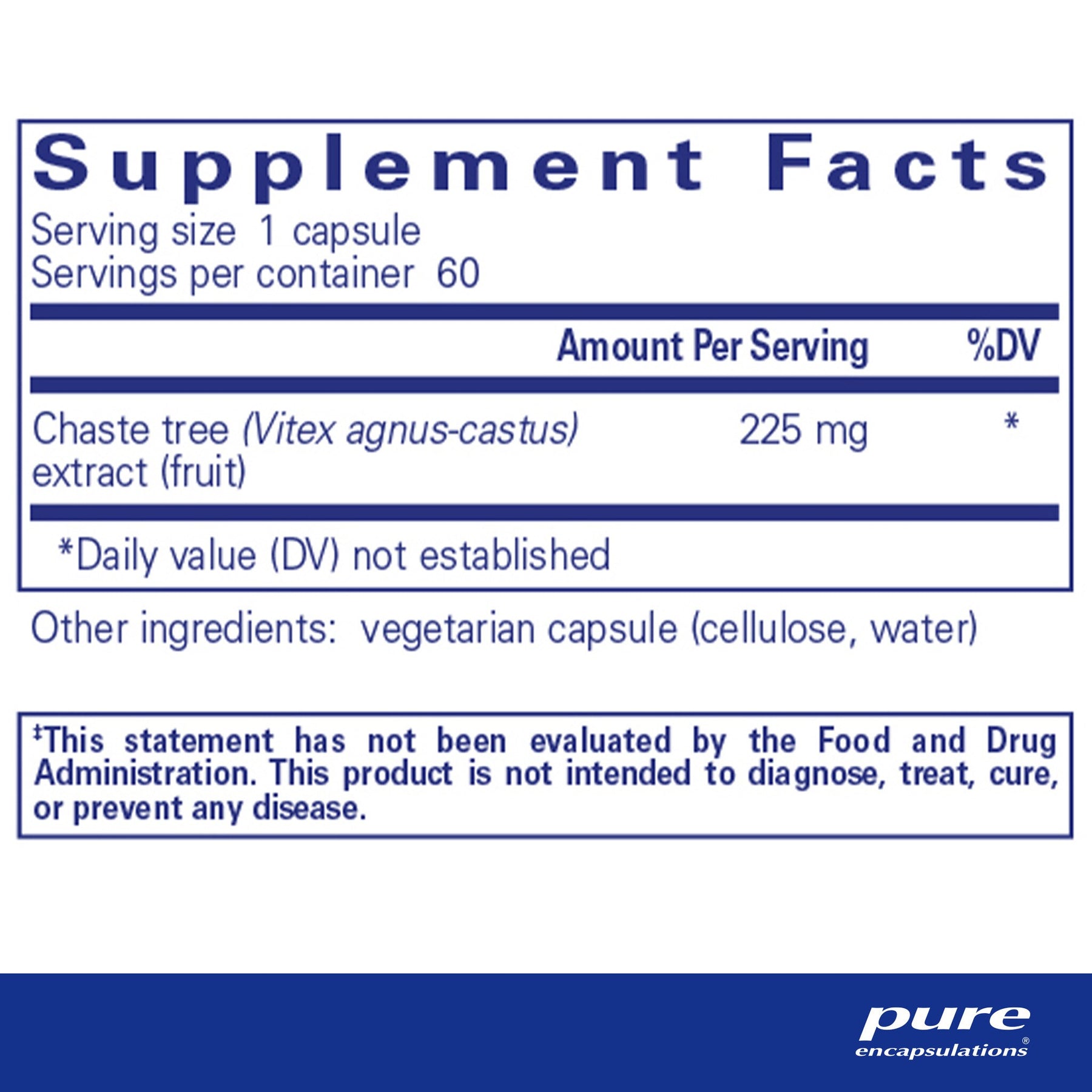 Chaste tree extract, also known as Vitex, contains flavonoids, iridoid glycosides, and terpenoids. It has been associated with supporting breast comfort and positive mood during the menstrual cycle, as suggested by numerous randomized, double-blind, placebo-controlled trials. It has also been associated with promoting healthy menstrual luteal phase length and menstrual regularity for some women, helping to maintain healthy reproductive system function.‡