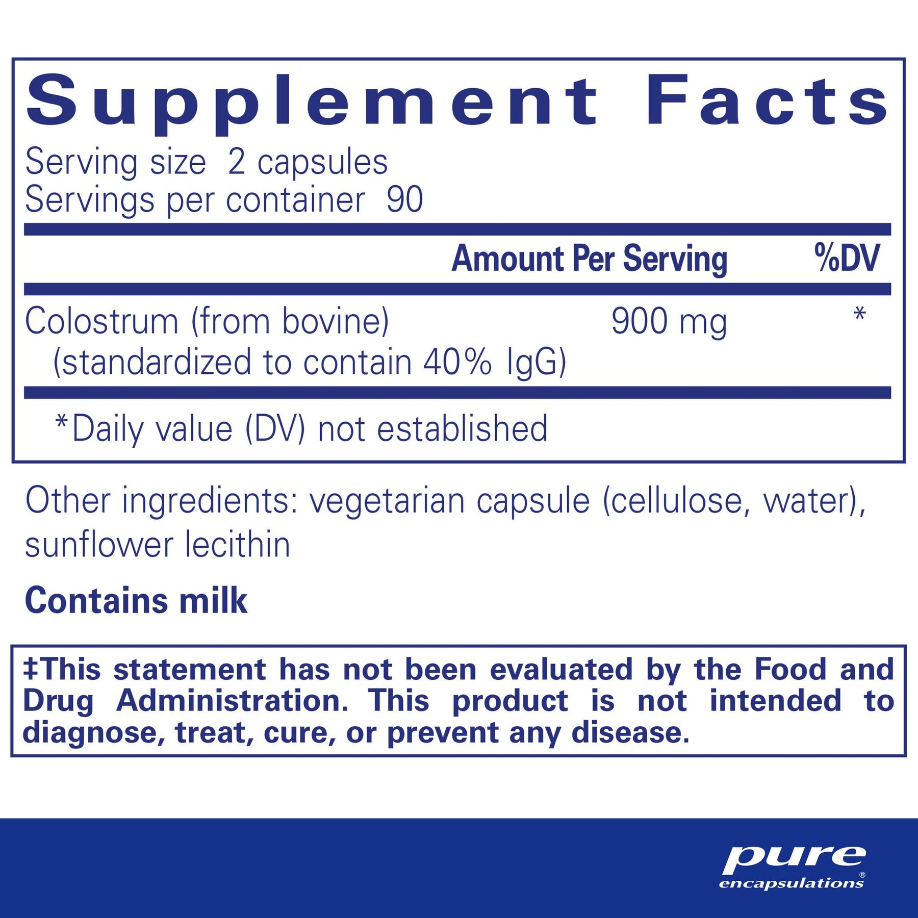 Colostrum is a highly-concentrated source of immune and growth factors produced from mammary glands shortly after giving birth. Pure Encapsulations Colostrum is derived from BSE-, hormone-, pesticide- and antibiotic-free USDA certified dairy farms in the U.S. It is collected after the first 24 hours, defatted and standardized to contain 40% IgG. Colostrum contains immunoglobulins G (IgG), A (IgA), E (IgE), D (IgD), and M (IgM). Each has a specific role in immune health. IgG is naturally found in the highest concentration. Other naturally occurring immune support compounds include lactoferrin, proline-rich polypeptide (PRP), lymphokines, interferons, interleukins, oligosaccharides, lysozymes, insulin growth factors (IGF-1 and IGF-2) and transforming growth factors (TGF-A and TGF-B).‡
