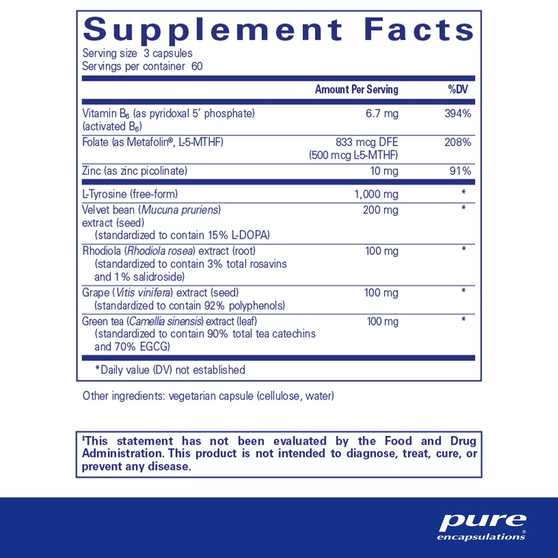 • Includes the cofactors vitamin B6, Metafolin L-5-MTHF, and zinc to support dopamine production