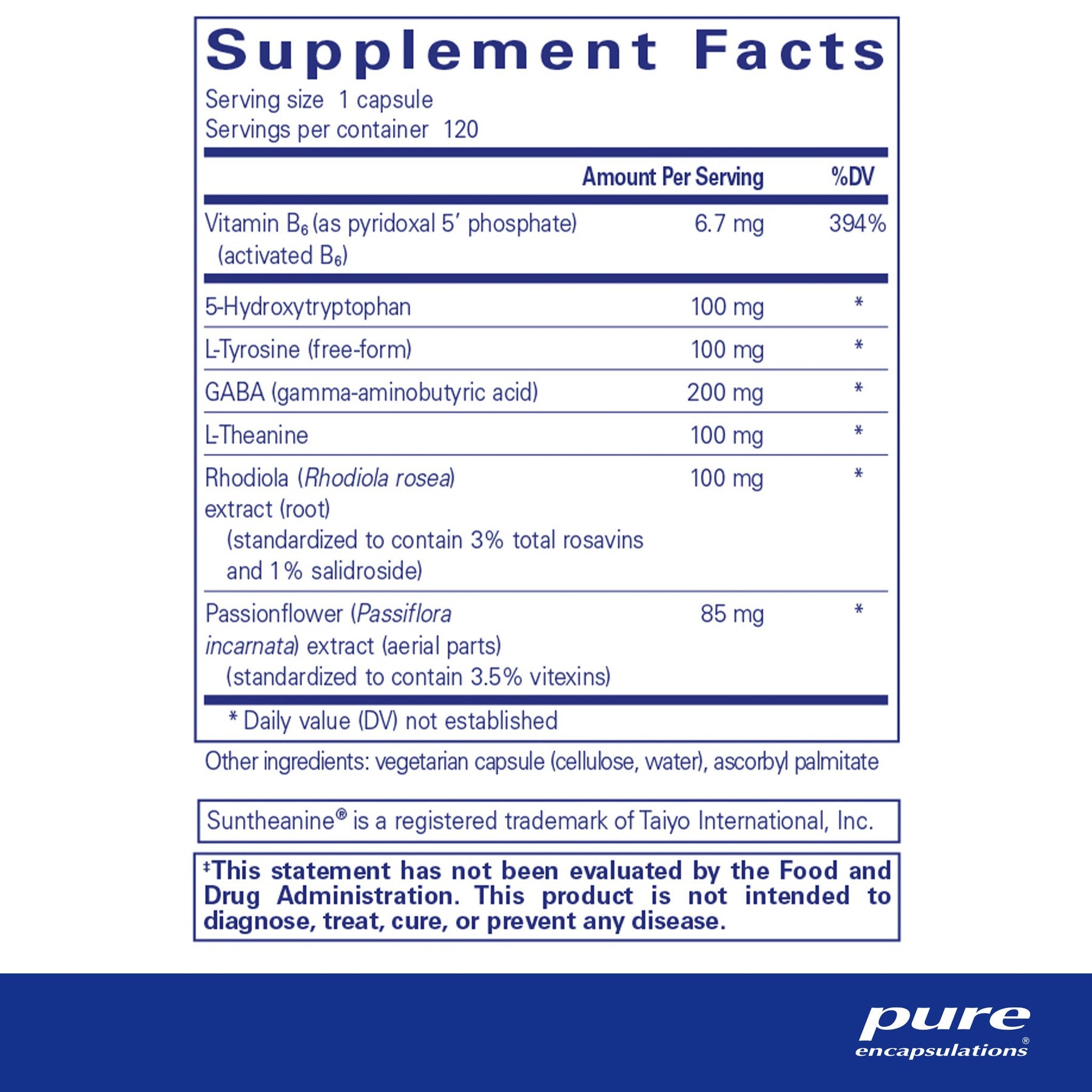 5-hydroxytryptophan and l-tyrosine are key precursors for the synthesis of several neurotransmitters responsible for a healthy emotional outlook, including serotonin, dopamine, epinephrine and norepinephrine. These neurotransmitters are involved in the regulation of endocrine and brain activity in addition to sleep/wake cycles. Research suggests that l-tyrosine may also support cognitive function and memory under stressful conditions. A healthy level of the inhibitory neurotransmitter GABA is also associated with positive mood. Research suggests that both GABA and l-theanine enhance alpha wave production in the brain, promoting relaxation. Complementary support for relaxation is provided by passionflower, while Rhodiola rosea supports cognitive and mental function under stressful conditions. Vitamin B6 is a cofactor that plays an important role in supporting positive emotional health.