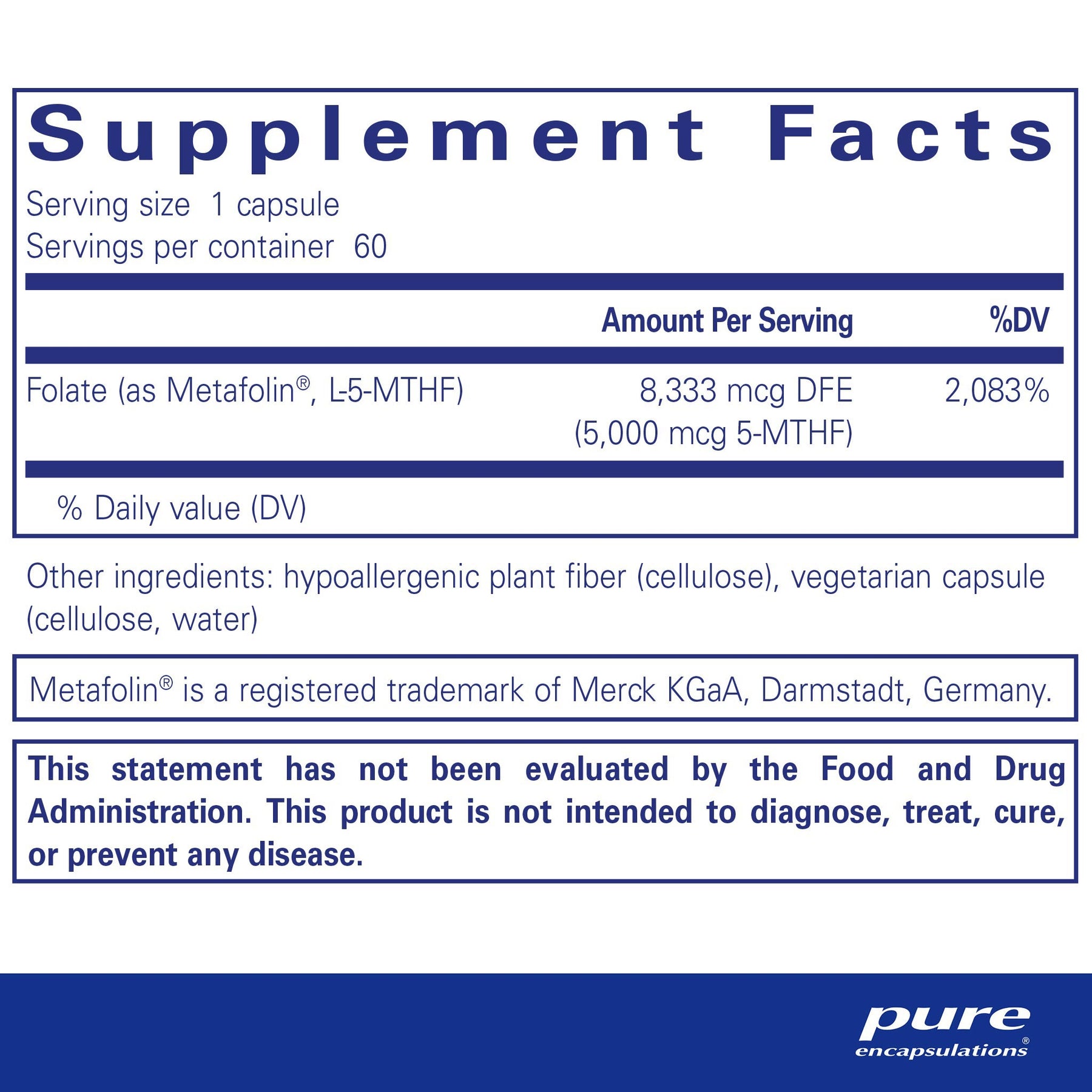 Folate 5,000 provides 5,000 mcg of folate as 5-methyltetrahydrofolate (5-MTHF), the universally metabolized and biologically active form of folate.