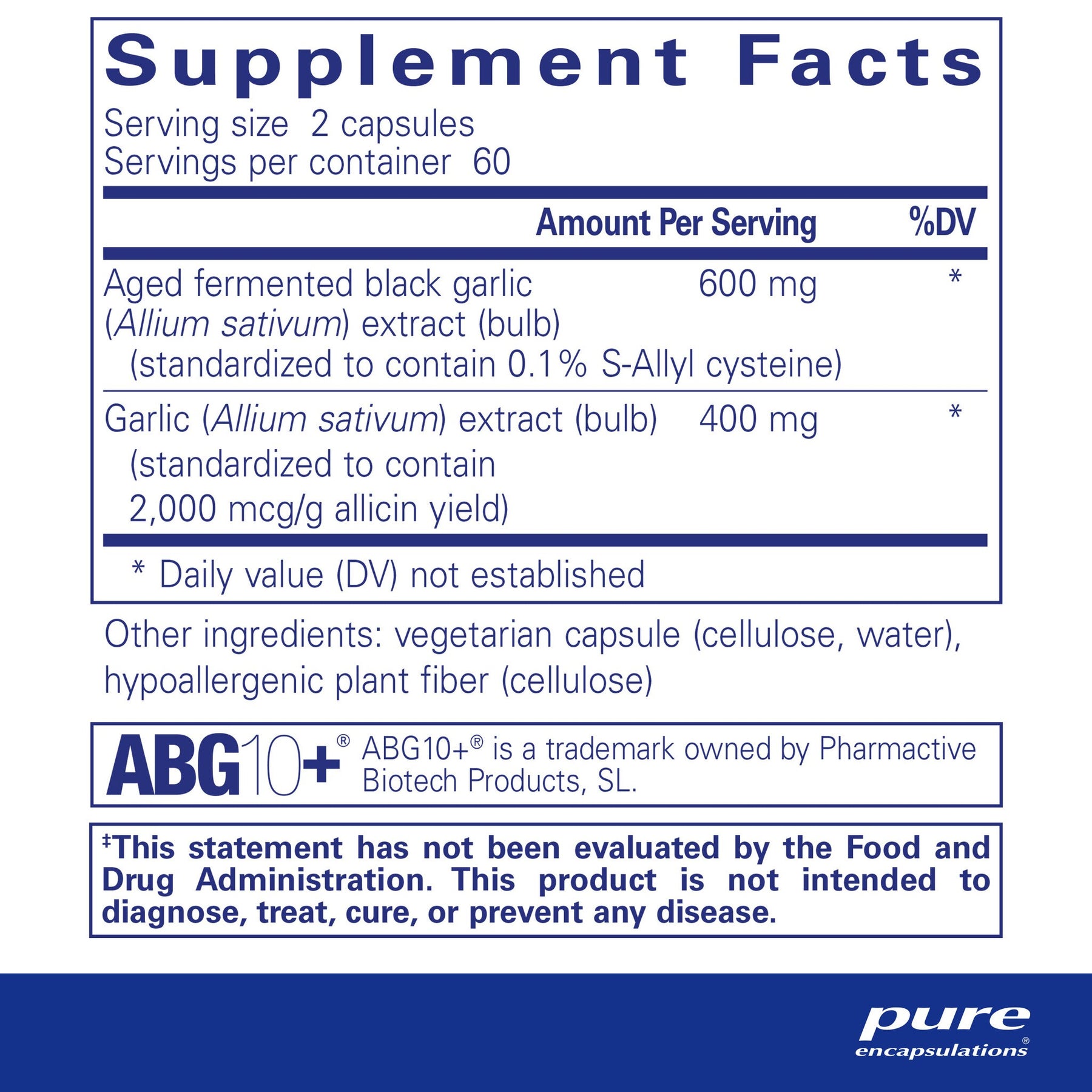Garlic Complex provides a unique combination of aged fermented black garlic extract and garlic extract. This combination offers cardiovascular and immune support properties, while also reducing the odor and sharp taste typically associated with raw garlic and garlic extracts. ¨The health-promoting effects of garlic are derived from its sulphur-containing compounds, including allicin and S-allyl-cysteine (SAC). The fermentation and aging process utilized in the production of black garlic increases the levels of SAC and other bioactive compounds, including phenols and flavonoids. These compounds act as antioxidants in the body to protect tissues and support cellular function. Animal and cell studies suggest that the cardiometabolic effects from aged black garlic are due primarily to antioxidant and cytokine balance support, stemming partly from alterations in gene expression. In a randomized, double-blind trial involving 60 adults, 12 weeks of supplementation with 6 grams of aged black garlic revealed support for healthy lipid metabolism. Standard garlic extract is included to promote broad-spectrum cardiovascular health, including support for healthy blood flow and platelet function, healthy lipid and triglyceride metabolism, and healthy arterial function. Garlic has also demonstrated support for maintaining a healthy gut ecology and promoting healthy immune system function.‡