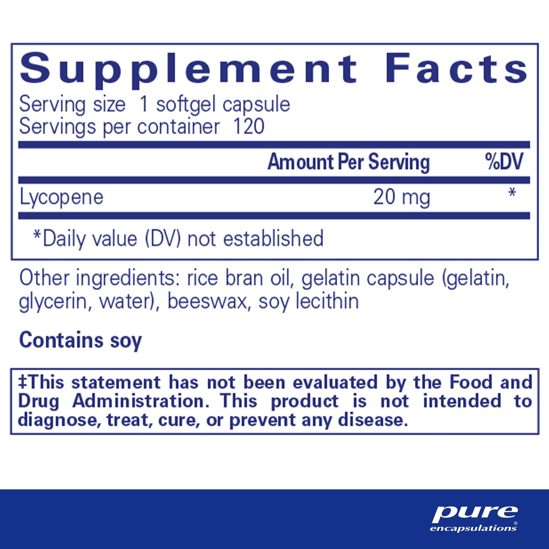 Pure Encapsulations' Lycopene provides a natural tomato extract rich in lycopene, various carotenoids, vitamin E, and other important phytochemicals. Data from over 47,000 participants in the Health Professionals Follow-Up Study suggested that tomato or lycopene intake was positively associated with prostate cell health. In another study involving 30 male subjects, supplementation with lycopene promoted healthy prostate function. This was one of the first randomized, prospective clinical trials to suggest that a lycopene supplement, rather than dietary tomato consumption, supported prostate health. Research compiled in a multi-center study involving ten European countries revealed that the antioxidant properties of dietary lycopene supported cardiovascular health. Fifty-seven epidemiological studies indicate that lycopene from tomato consumption or tomato-based products may help digestive, lung, cervical and breast cell health. Lycopene has also demonstrated potential for promoting retinal and macular health.