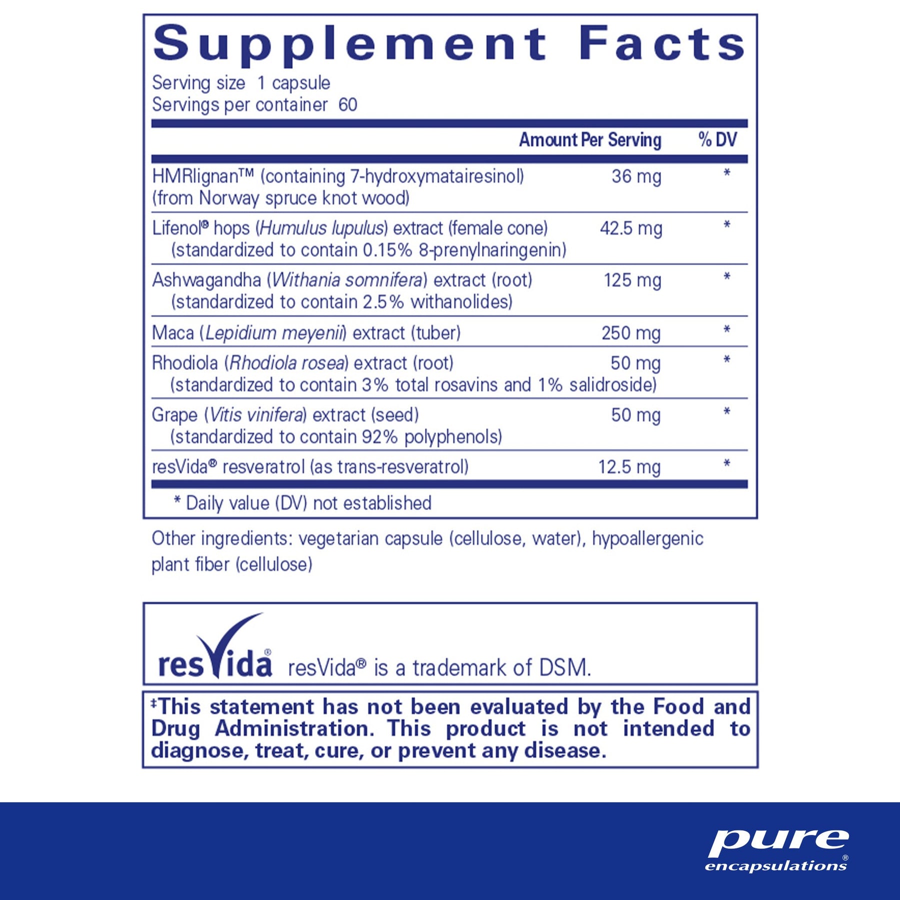 HMRlignan contains the lignan 7-hydroxymatairesinol, a precursor to enterolactone, which has been associated with a healthy estrogen-to-progesterone ratio and cellular health. As a result, lignans have demonstrated supportive roles in moderating hot flashes as well as supporting breast, uterine, cervical, bone and cognitive health. Importantly, dietary intake of lignans and healthy serum enterolactone levels are also positively associated with supporting healthy cardiovascular function. Lifenol hops extract contains 8-prenylnaringenin (8-PN), offering support for menopausal comfort, antioxidant defense and bone health. In addition to promoting emotional well-being, maca also offers support for sexual function. While rhodiola has long been known to support endurance, recent research suggests that it may act as a selective estrogen receptor modulator to support cognitive, cardiovascular and bone health. Grape seed extract and resveratrol support menopausal comfort, as well as bone, cognitive and cardiovascular health.*