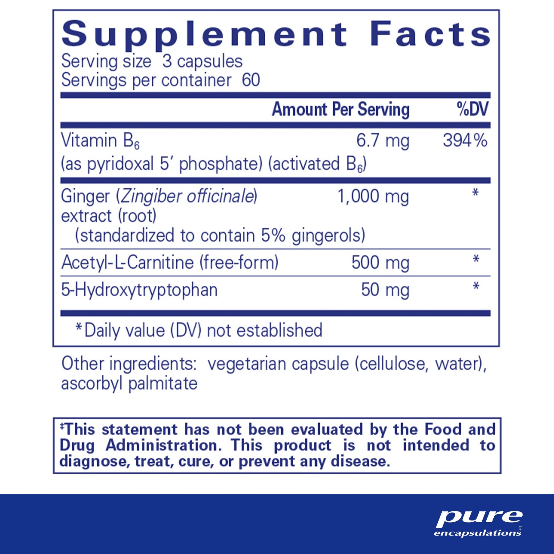 MotilPro supports serotonergic and cholinergic neurotransmission in the G.I. tract. 5-HTP is absorbed by enterochromaffin cells in the epithelium, in which it is decarboxylated to serotonin using pyridoxal 5' phosphate as a cofactor. 5-HTP stimulates enteric neurons through activation of 5HT4 receptors. Ginger modulates serotonin signaling by additional 5HT4 stimulation and by binding type 3 (5HT3) receptors in the enteric nervous system and brain stem, supporting gastric emptying, intestinal transit, healthy visceral sensation and upper G.I. comfort. Acetyl-l-carnitine supports autonomic neuronal health and contributes acetyl groups for the synthesis of acetylcholine, supporting neurotransmission of signals to encourage healthy motility.‡