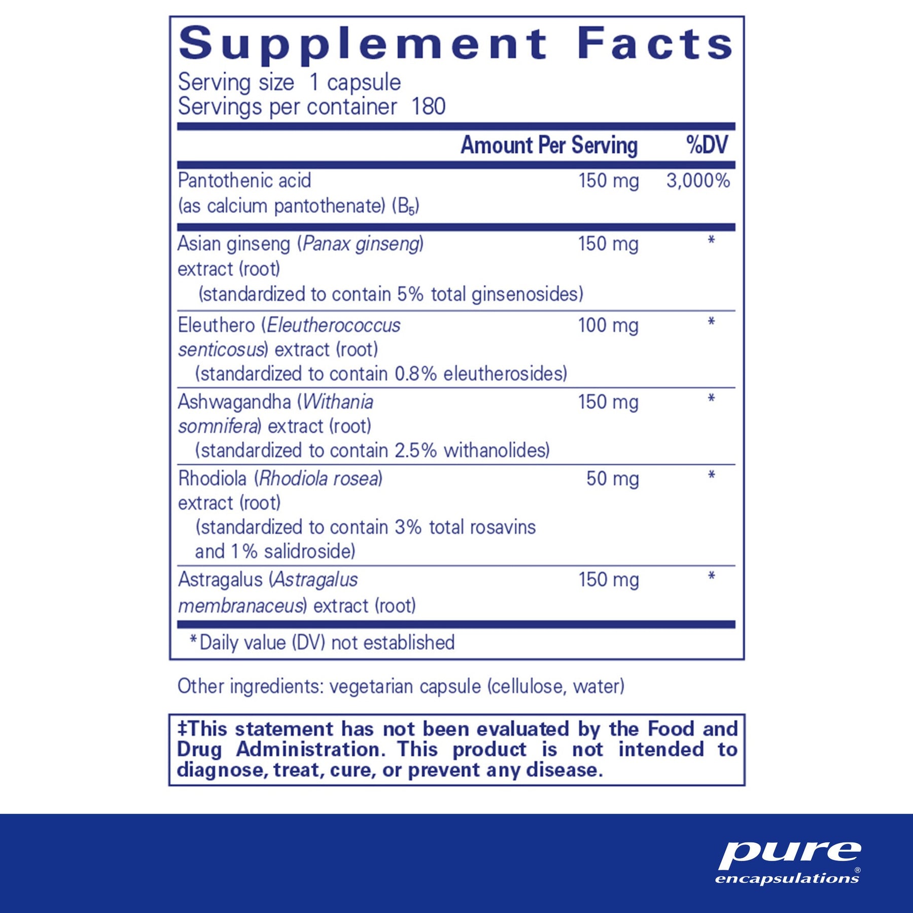 This vegetarian formula provides wide range herbal and nutritional support for the adrenal glands. Panax ginseng and Eleutherococcus senticosus, or eleuthero, are highly recognized adaptogens, promoting physiological balance and moderating occasional stress. In part, they help to moderate the production of adrenocorticotrophic hormone (ACTH) and ultimately corticosterone activity. Corticosterone promotes the conversion of amino acids into carbohydrates and glycogen by the liver and stimulates glycogen formation in the tissues, supporting optimal energy reserves. Rhodiola rosea, containing rosavins and salidrosides, also acts to balance hypothalamic-pituitary-adrenal activity. Rhodiola can have a calming effect on the central nervous system and supports healthy thyroid, thymus, and adrenal gland function. In particular, rhodiola may moderate the effects of occasional physical and emotional stress. Recently, a double-blind, crossover study suggested that rhodiola may help to moderate mild fatigue under stressful conditions. Astragalus and ashwagandha promote immune function and complement the adaptogenic activity of this formula. Calcium pantothenate, a vitamin B5 derivative, is essential for activating the adrenals. Collectively, these ingredients support the health and activity of the adrenal glands.