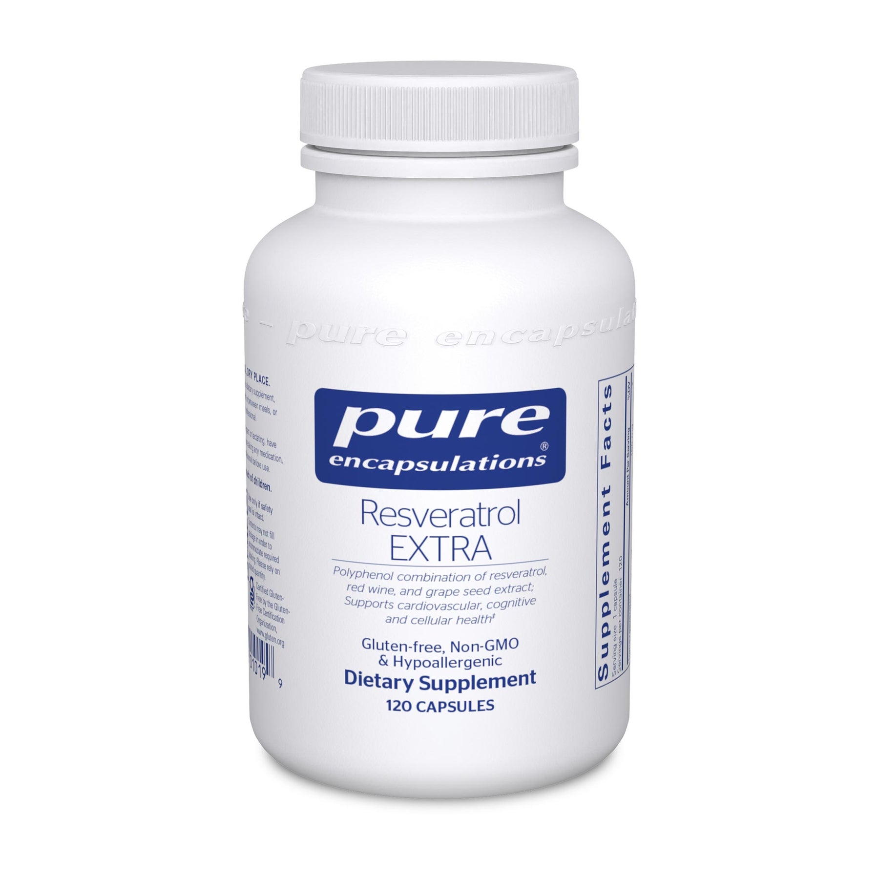 Resveratrol promotes cardiovascular health, helping to maintain healthy platelet function and arachidonic acid metabolism. A recent Harvard study suggests that it may also promote overall health, metabolic function and longevity. Grape seed extract and red wine concentrate offer polyphenols, complementing the cellular and cardiovascular health benefits of this complex. One capsule of Resveratrol EXTRA contains the amount of resveratrol equivalent to an average of 66 bottles of red wine.