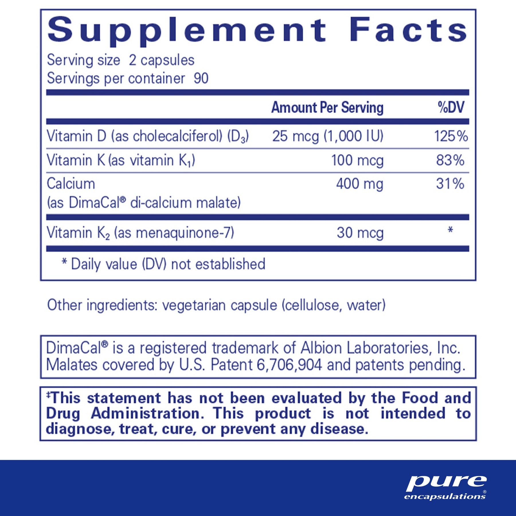 Calcium K/D combines di-calcium malate with vitamins D and K for optimal bone support. Di-calcium malate provides a high percentage of elemental calcium, fully chelated with the Krebs cycle intermediate malate for optimal absorption. Vitamin D promotes intestinal calcium absorption and reduces urinary calcium loss. A 7-year study involving over 30,000 women indicates that combined calcium and vitamin D supplementation promotes healthy hip bones. Vitamin K enhances bone formation by carboxylating osteocalcin. This enables osteocalcin to bind to calcium and promote healthy bone mineralization. Adequate intake of vitamin K1 and K2 may be especially important for optimal carboxylation in aging individuals. By activating matrix Gla–protein (mg.P), vitamin K also helps maintain healthy calcium metabolism in vascular tissues, supporting healthy vascular elasticity.*