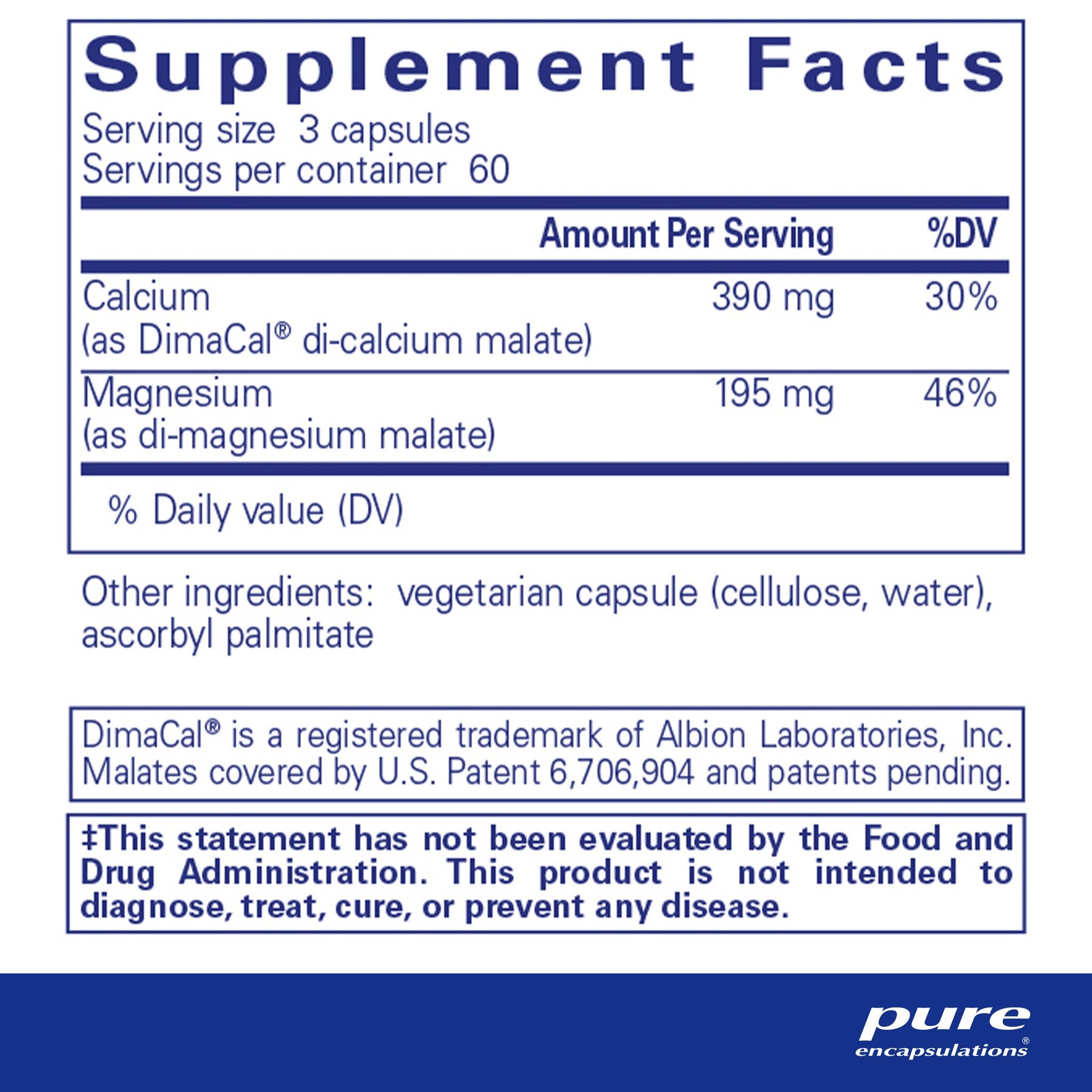 Combines di-calcium malate and di-magnesium malate for the highest elemental calcium and magnesium per capsule. These minerals are chelated with the krebs cycle intermediate malate for optimal absorption. **When providing adequate calcium throughout life as a part of a well balanced diet.